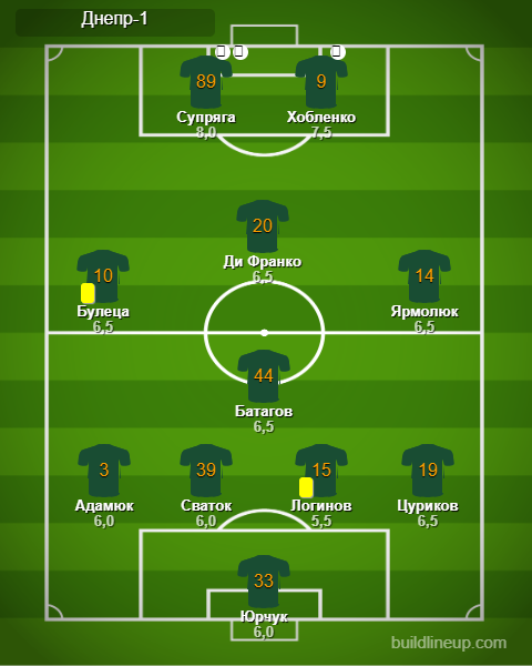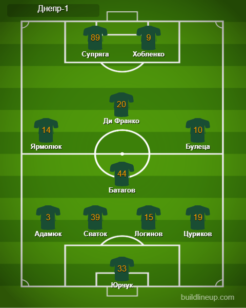 «Днепр-1»: Юрчук — Адамюк, Сваток (Кравченко, 46), Логинов (Лопыренок, 46), Цуриков (Полевой, 62) — Батагов — Ярмолюк, Ди Франко, Булеца (Сабатини, 69) — Супряга, Хобленко (Назаренко, 69).