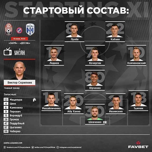 В поединке 32-го тура УПЛ луганская «Заря» примет черниговскую «Десну». Поединок состоится в воскресенье, 19-го июля, в 19:30 по киевскому времени.