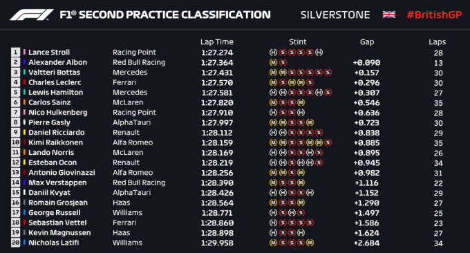 Лучшее время во второй практике Гран-при Великобритании показал пилот Рэйсинг Поинт Лэнс Стролл, который на 0,1 секунды опередил Алекса Альбона из Ред Булла.