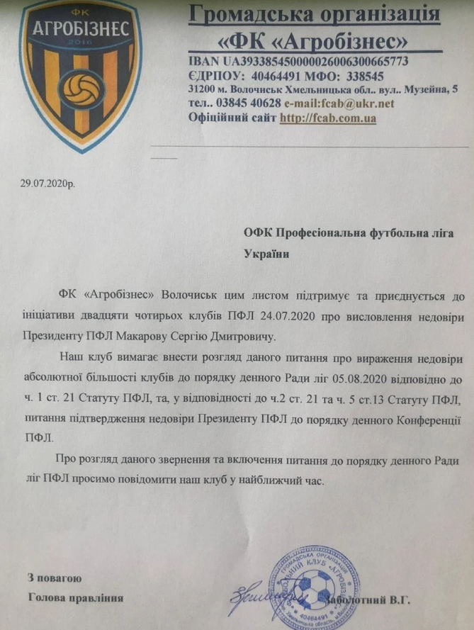 Теперь к числу этих клубов присоединился еще один клуб Первой лиги – «Агробизнес». Об этом клуб сообщил в своем письме от 29 июля: