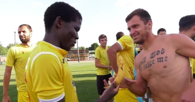 Партнеры после матча поздравили игрока и в шутку вручили ему половинку банана, а также покричала «Нет расизму».