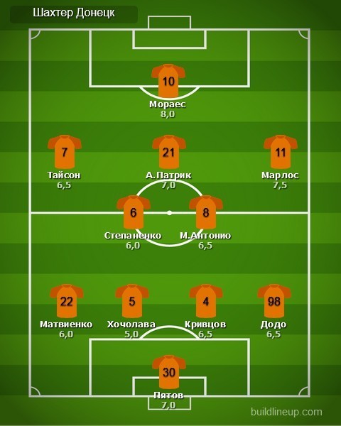 «Шахтер»: Андрей Пятов, Николай Матвиенко, Додо, Сергей Кривцов, Давид Хочолава, Ромеро Марлос (Манор Соломон, 77), Алан Патрик, Тайсон (Евгений Коноплянка, 86), Маркос Антонио (Виктор Коваленко, 74), Тарас Степаненко, Жуниор Мораес