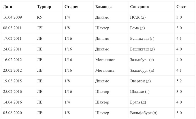 «Шахтер» выиграл у «Вольфсбурга» со счетом 3:0, и эта победа стала для «горняков» четвертой с крупным счетом на стадии плей-офф еврокубков.