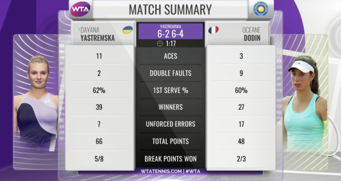 Даяна Ястремская (Украина) – Осеан Доден (Франция) – 6:2, 6:4