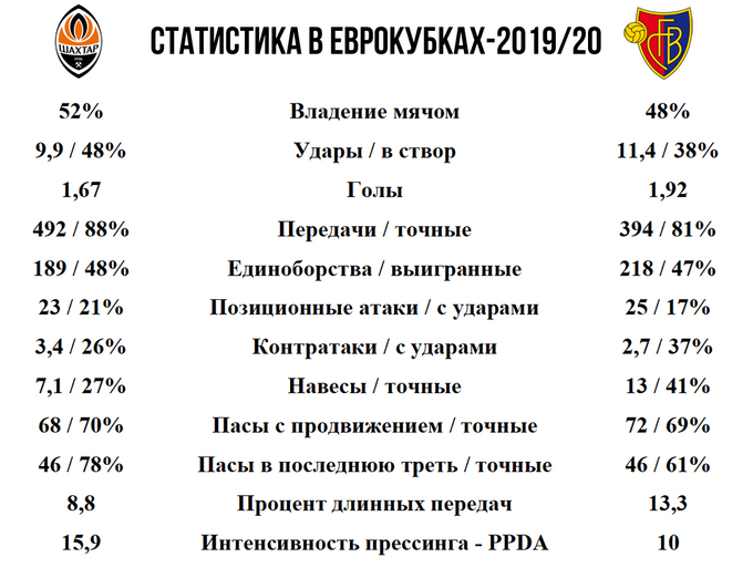 Однако в целом игра «Базеля» стилистически отличается от того, как действует «Шахтер». Чтобы лучше сравнить между собой эти команды, мы предлагаем статистику нынешнего еврокубкового сезона, где уровень все-таки более корректен для сравнения, нежели в матчах чемпионатов Украины и Швейцарии.
