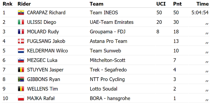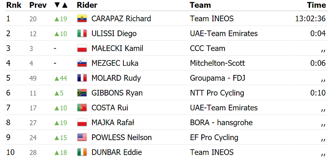 Действующий победитель Джиро д’Италия Ричард Карапас выиграл третий этап Тура Польши. Эквадорский гонщик «Ineos» опередил Диего Улисси и Руди Молара, благодаря чему перехватил лидерство в общем зачете многодневки.