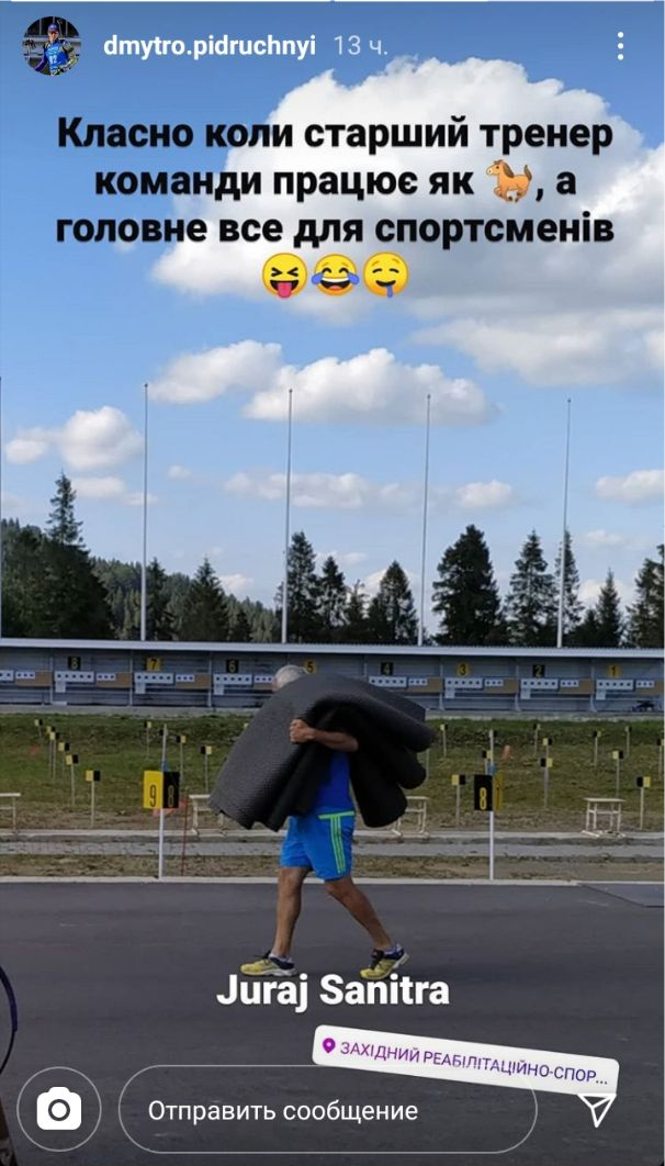 Лучший биатлонист сборной Украины Дмитрий Пидручный показал, как на тренировочном сборе в Сянках наставник Юрай Санитра несет несколько резиновых ковриков для стрельбы.