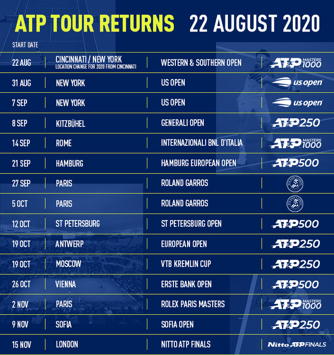 ФОТО. ATP опубликовала график проведения турниров до конца сезона