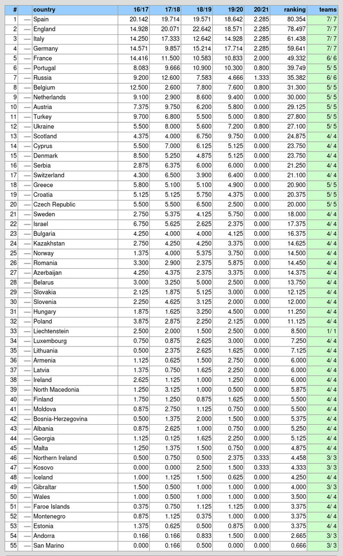 Таблица коэффициентов УЕФА 2021 (влияет на распределение путевок в сезоне 2022/23)