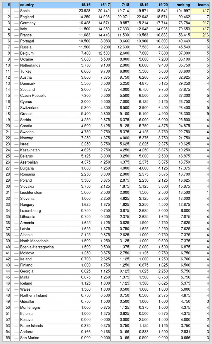 Таблица коэффициентов УЕФА 2020 (влияет на распределение путевок в сезоне 2021/22)
