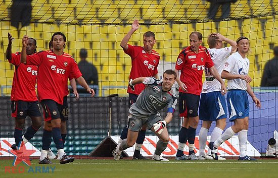 А это фото запечатлело тот распространенный в футболе случай, когда недовольны все. И армейцы, и питерцы, а Акинфеев так и вовсе сейчас подбежит и даст кому-нибудь по голове.