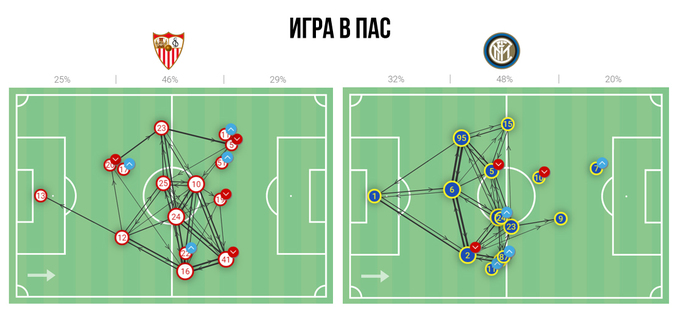 В то время, пока «Интер» активно задействовал Хандановича (еще один отсыл к игре «Шахтера» против самих «нерадзурри») в розыгрыше комбинаций, что привело к увеличению процента пребывания мяча в первой и второй третях поля, «Севилья» старалась действовать максимально резко и агрессивно в атаке. Благодаря этому испанцы в среднем чаще находились на половине поля соперника, больше пасовали в финальной трети (29% против 20%), а также лучше продвигали мяч при в целом меньшем числе выполняемых пасов (53 передачи с продвижением у «Севильи» против 50 – у «Интера»).
