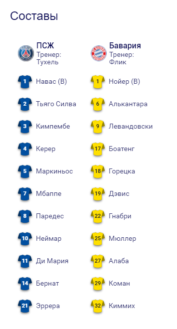 ПСЖ – Бавария. Финал Лиги чемпионов. Стартовые составы команд