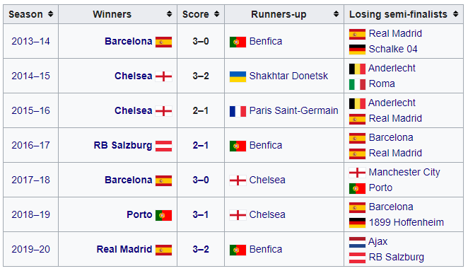 Испанская команда переиграла в финале «Бенфику» из Португалии со счетом 3:2.