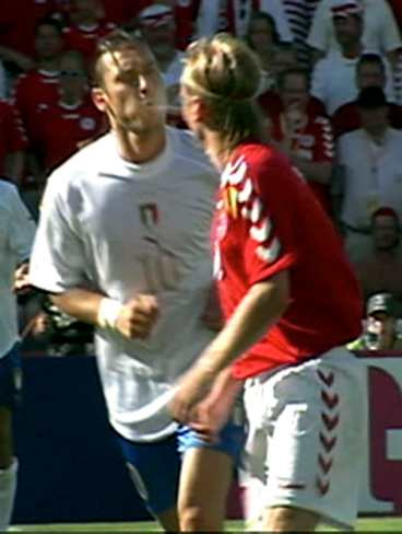 Обратите свой взор назад во времени, или зайдите на YouTube, если ваша память уже не настолько хороша, как была ранее, и вы увидете, что произошло 14 июня 2004 года. Тотти выбегает из штрафной площадки соперника, и Поульсен немного подталкивает его плечом (таких игровых моментов в любой игре - несчесть!). То, как ответил на это 10 номер Скуадры Адзурры - просто не поддаётся объяснению. Взглянув в лицо датчанину, Тотти изверг из себя комок слизи прямо в лицо своему сопернику.