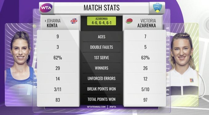 Другую путевку в финал разыграли Йоханна Конта и Виктория Азаренко. Бывшая первая ракетка мира одержала победу в трех партиях.