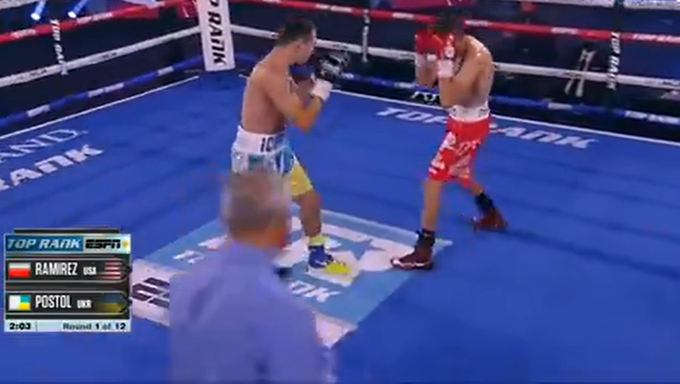 06:10. 2-й раунд. Работа идет на дистанции. Мало сближений, почти нет клинчей. Рамирес занял центр ринга и обстреливает украинца издалека. Постол больше действует вторым номером.