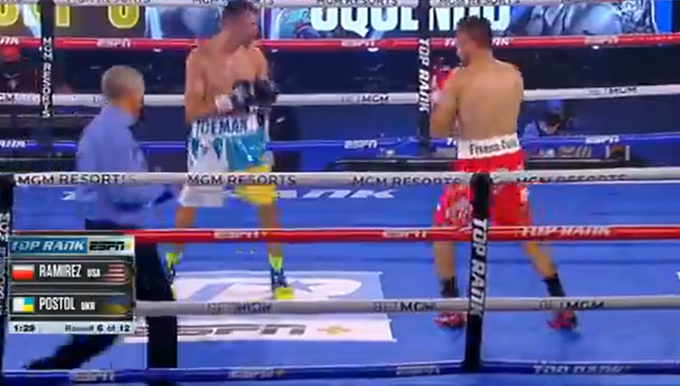 06:22. 5-й раунд. Преимущество Рамиреса все более заметно. Постол старается действовать на скорости, но Рамирес стал попадать чаще. Концовку Хосе провел мощно и забрал себе очередной раунд.