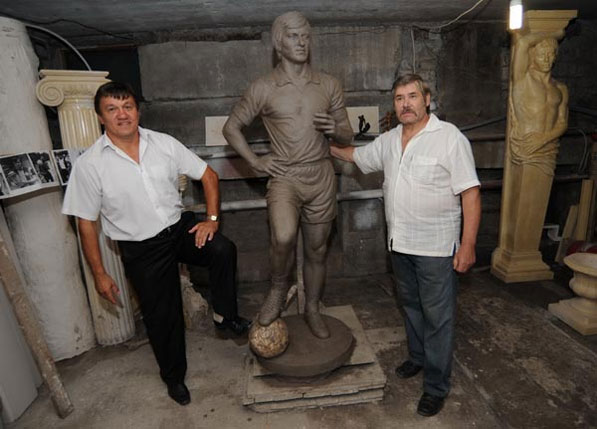 — Откровенно говоря, когда я услышал о том, что готовится моя скульптура для клубного музея — не поверил, — делится бывший капитан «Шахтера» Михаил Соколовский, рассматривая своего глиняного двойника. — А в целом, я доволен тем, что сейчас вижу. Мне кажется, что художник в точности повторил мою фигуру и внешность. Вот только надо бы немного мышц на бедрах нарастить.