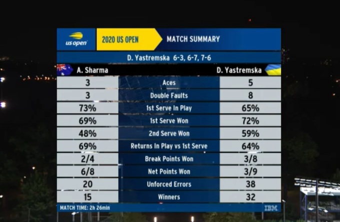 Шарма перешла от более защитной игры в позицию атакующую. Возможно, она играла чуть менее агрессивно, чем украинка, но все равно это приносило свои плоды. Ястремская с течением времени заметно уставала и ошибалась, разница в классе теннисисток становилась все менее заметной.