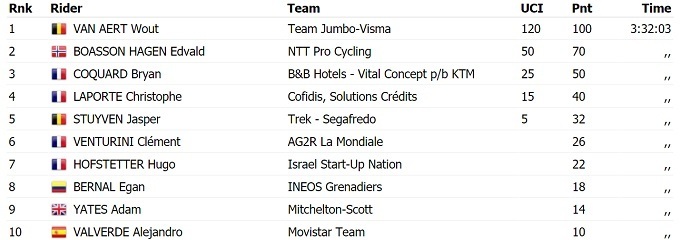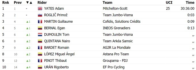 Главным событием этапа стали эшелоны, в которых 1 минуту и 21 секунду потеряли претенденты на общий зачет – Тадей Погачар, Микель Ланда, Ричи Порт, Бауке Моллема и Ричард Карапас. Желтую майку лидера сохранил Адам Йейтс.