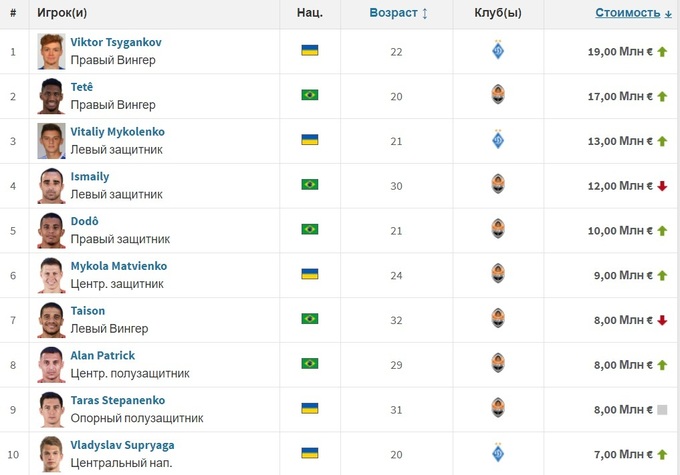 Самым дорогим игроком украинского первенства остался вингер «Динамо» Виктор Цыганков, который добавил в цене 3 миллиона евро (стало 19). Также в тройке находится его одноклубник Виталий Миколенко (13 млн евро), который подорожал на 4 миллиона, и вингер «Шахтера» Тете (17 млн евро, +1,5).