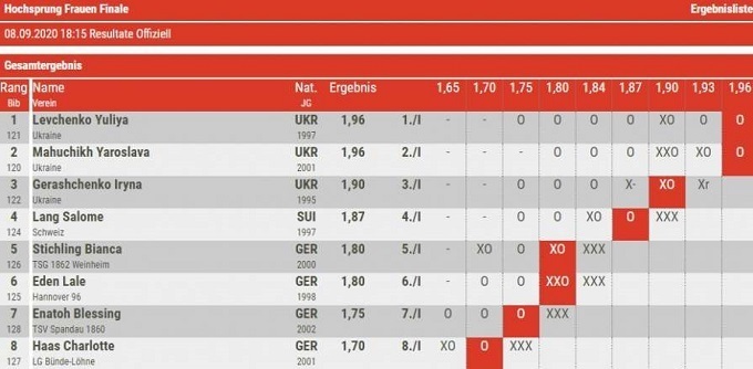 Они завершились тотальным триумфом Украины: первые три места заняли Юлия Левченко, Ярослава Магучих и Ирина Геращенко. Левченко и Магучих взяли высоту 196 см, однако Магучих проиграла за счет того, что затратила больше попыток на предыдущих высотах.