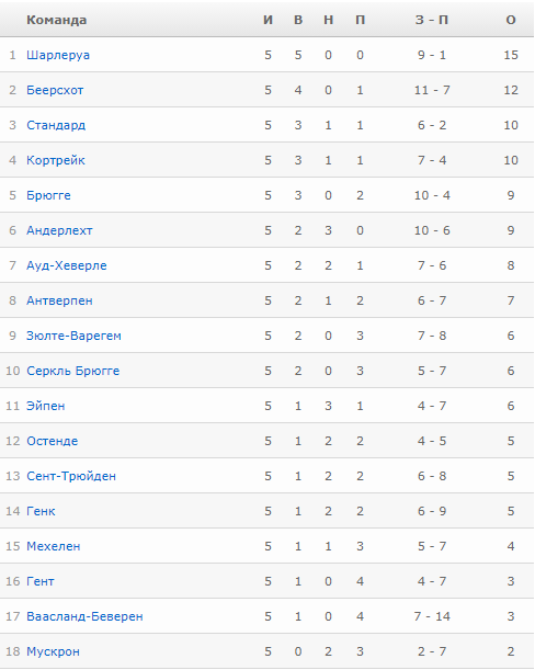 Турнирная таблица чемпионата Бельгии