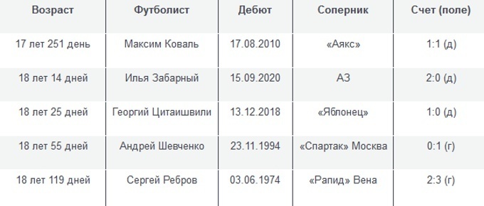 Забарный в плане возраста дебюта в Европе обошел Андрея Шевченко и Сергея Реброва.