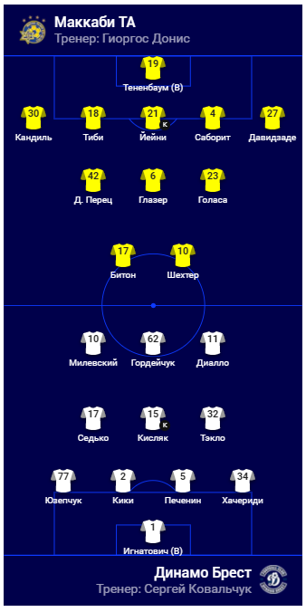 На поле в 20:00 выйдут израильский «Маккаби» Тель-Авив и «Динамо» из Бреста.