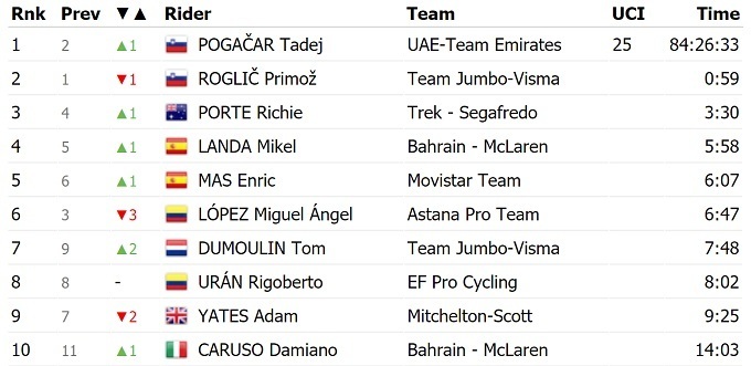 Примож Роглич, который лидировал в общем зачете на протяжении двух недель, занял пятое место на этапе и отступил на вторую позицию в генеральной классификации.
