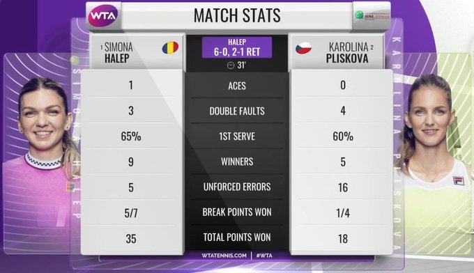 Симона Халеп (Румыния) – Каролина Плишкова (Чехия) – 6:0, 2:1 (отказ)