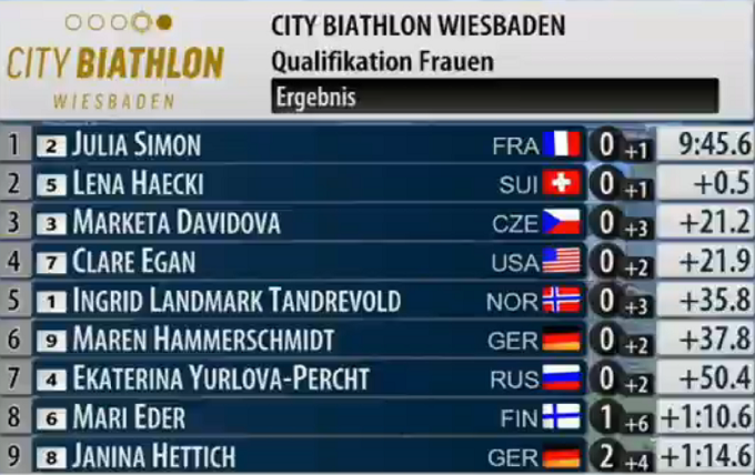 15:47. Симон обошла Хекки перед стрельбой. Но это скорее психологический маневр от француженки.
