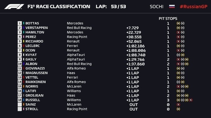 Топ-10: Боттас, Ферстаппен, Хэмилтон, Перес, Риккардо, Леклер, Окон, Квят, Гасли, Альбон