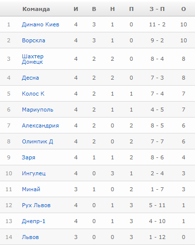 Первые две позиции в турнирной таблице занимают киевское «Динамо» и полтавская «Ворскла» (по 10 очков)