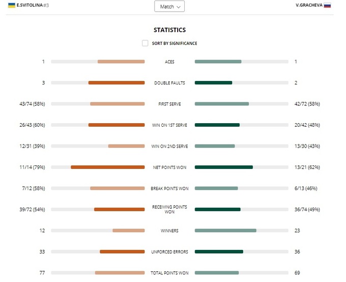 Элина продолжает побеждать, но ее игра пока очень далека от идеала. Матч против Грачевой показал, что Свитолина может включиться в нужные моменты, но большую часть поединка она проводит на более низком уровне.