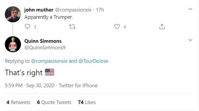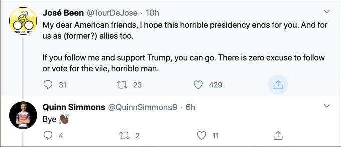 В ответ 19-летний американский велогонщик команды Мирового тура «Trek-Segafredo» и чемпион мира среди юниоров 2019 года Куинн Симмонс попрощался с Беен: