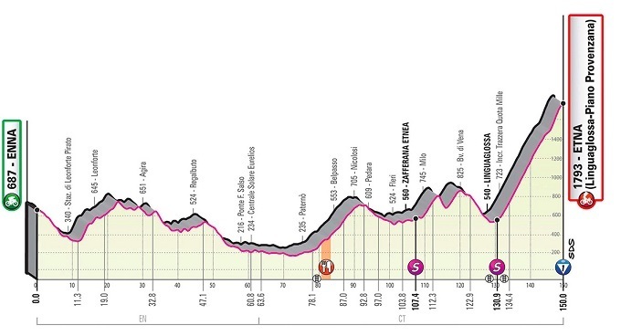 В целом в топ-5 ключевых можно было включить только этапы начиная с 14-го. Однако мы решили добавить разнообразия, и включить в рейтинг ключевой этап первой недели. Речь идет о третьем этапе с финишем на вулкане Этна, от Лингуаглоссы: 20 км со средним градиентом 6,2%, и очень непростыми финишными километрами.