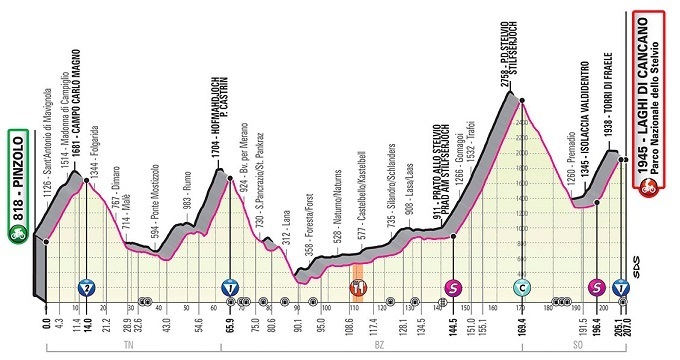 18-й этап обещает быть еще более сложным. С самого начала гонщики преодолеют два перевала – первой и второй категорий. После этого гонщиков ждет еще более сложное испытание: подъем на легендарный перевал Пассо делло Стельвио на высоту 2758 м над уровнем моря. Подъем на Стельвио через Трафои – это 24,3 км со средним градиентом 7,4%. В целом крутизна подъема на Стельвио довольно стабильная, хотя вторая половина перевала все же тяжелее первой. Стельвио в этом году получит статус «Чима Коппи» - высшей точки маршрута Джиро.