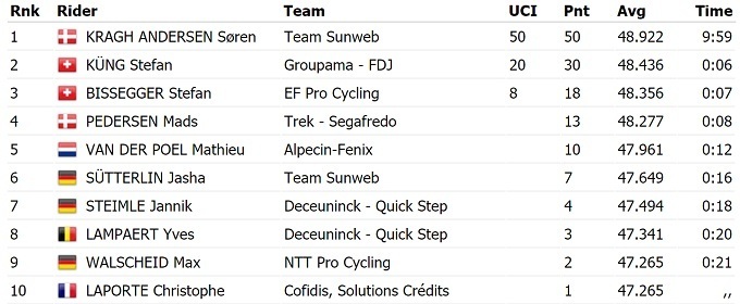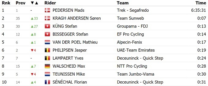 Лидерство в общем зачете сохранил соотечественник Крога Андерсена – Мадс Педерсен из «Trek Segafredo», который вчера выиграл второй этап многодневки.