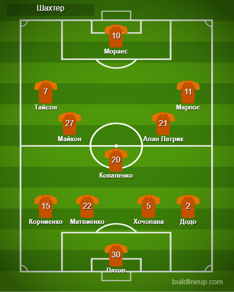 «Шахтер»: Андрей Пятов - Давид Хочолава, Додо, Виктор Корниенко, Николай Матвиенко - Майкон (Тете, 58), Алан Патрик (Тарас Степаненко, 46), Тайсон, Виктор Коваленко (Дентиньо, 77), Марлос (Манор Соломон, 46) - Жуниор Мораес (Фернандо, 58).