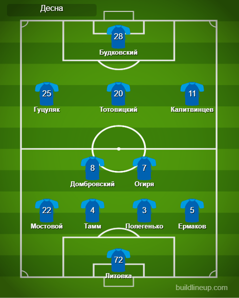 «Десна»: Игорь Литовка - Андрей Мостовой, Виталий Ермаков, Йоонас Тамм, Павел Полегенько - Андрей Тотовицкий, Владислав Калитвинцев (Сергей Старенький, 86), Владислав Огиря, Андрей Домбровский, Алексей Гуцуляк (Артур Западня, 90+2) – Филипп Будковский (Максим Дегтярёв, 81).