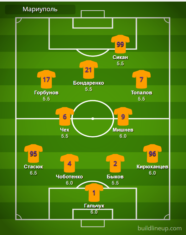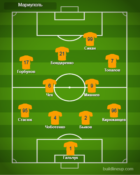 «Мариуполь»: Евгений Гальчук, Петр Стасюк, Сергей Чоботенко, Алексей Быков (Даниил Сагуткин,79), Игорь Кирюханцев, Максим Чех, Дмитрий Топалов, Дмитрий Мишнев, Артем Бондаренко, Сергей Горбунов, Даниил Сикан (Андрей Кулаков, 59)