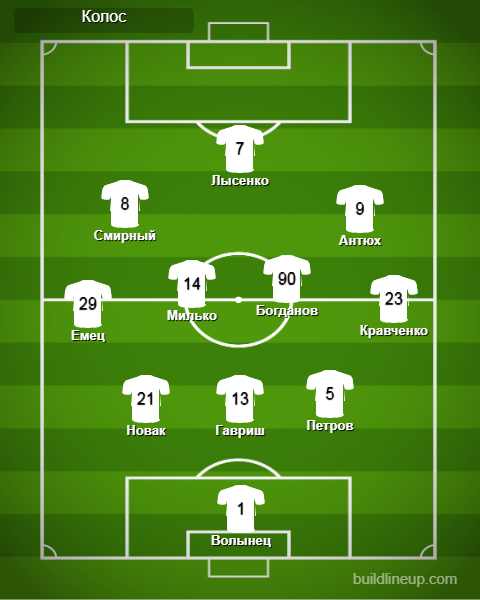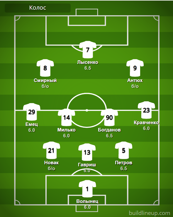 «Колос»: Евгений Волынец, Никита Кравченко, Виталий Гавриш (Александр Черноморец, 46), Кирилл Петров, Евгений Новак (Павел Ореховский, 24), Владислав Емец, Андрей Богданов, Вадим Милько, Евгений Смирный (Денис Костышин, 18), Денис Антюх (Олег Ильин, 7), Владимир Лысенко