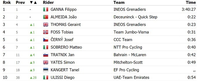 Розовую майку лидера общего зачета сохранил победитель первого этапа Филиппо Ганна из «Ineos».