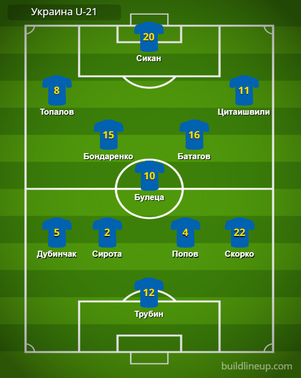 Украина U-21: Трубин – Дубинчак, Сирота, Попов, Скорко – Бондаренко (Чех, 64), Булеца, Батагов – Топалов (Леднев, 68), Сикан (Русин, 64), Цитаишвили (Назаренко, 64).