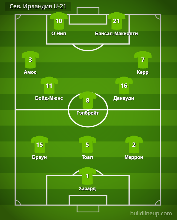 Северная Ирландия U-21: Хазард – Браун, Тоал, Меррон – Амос, Бойд-Мюнс, Гэлбрейт, Данвуди, Керр – О’Нил (Бонис, 76), Бансал-Макнолти (Маккирнен, 76).