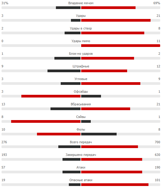 У команды Андрея Шевченко только чуть более 30% владения мячом. По количеству ударов хозяева уступили маститому сопернику: 3–21 (в створ: 2–8).
