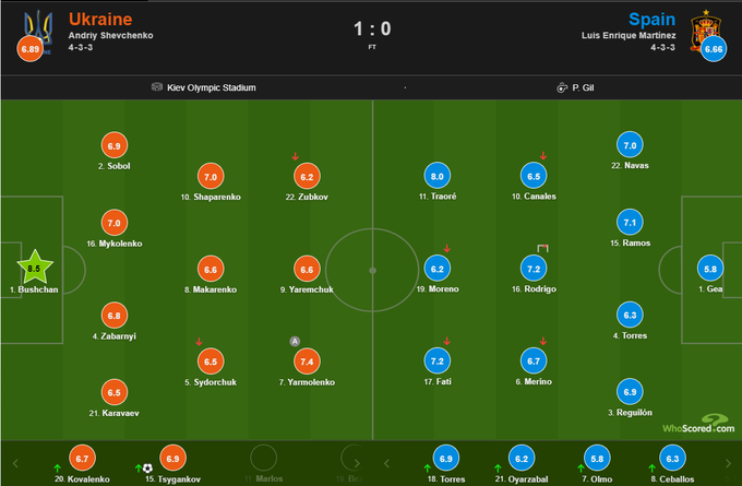 Оценки матча Украина – Испания (1:0) от WhoScored.
