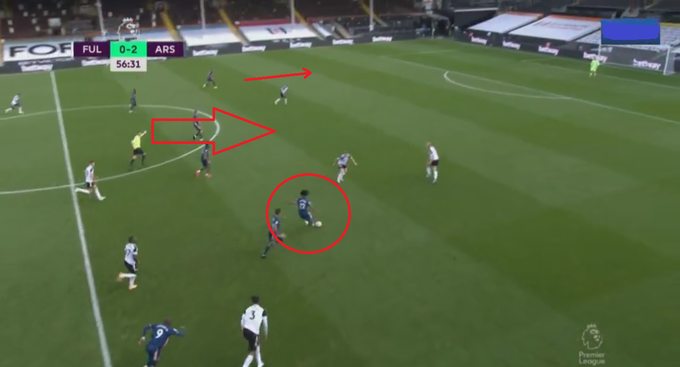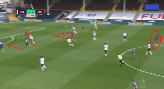Показательным является развитие атаки во время первого гола в сезоне для «Арсенала»: перепасовка между собой центральных защитников команды с подключением ускорившегося по левому флангу Тирни. Этот маневр позволяет отвлечь на себя правый фланг защиты «Фулхема», а Обамеянгу и Мэйтленду-Наилзу сместиться ближе к левому полуфлангу/центру атаки.